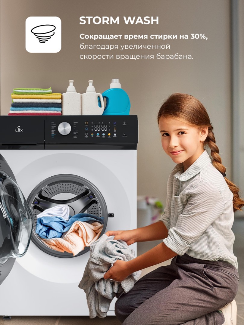 - Storm Wash: ускоряет процесс стирки за счет более интенсивного, но плавного увеличения оборотов. Качественная стирка за 15 минут — это реально! Интеллектуальная система автоматически определит вес белья и установит оптимальное время стирки.