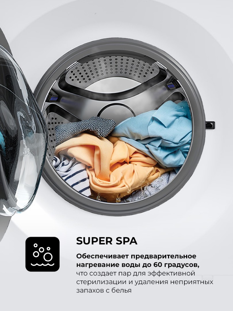 - Super Spa: программа предварительной стирки с нагревом воды до 60 градусов, обеспечивающая стерилизацию и дезодорацию белья в течение 30 минут.