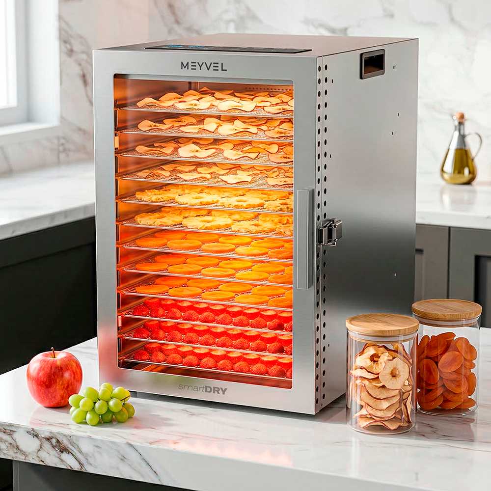 - Для фермеров и дачников. Модель Meyvel MDH12-1S (Нержавеющая Сталь) (Inox) справится с переработкой сезонных запасов. Можно за один цикл высушить урожай фруктов, грибов или овощей без потери вкуса и аромата.